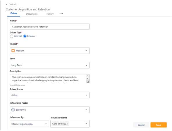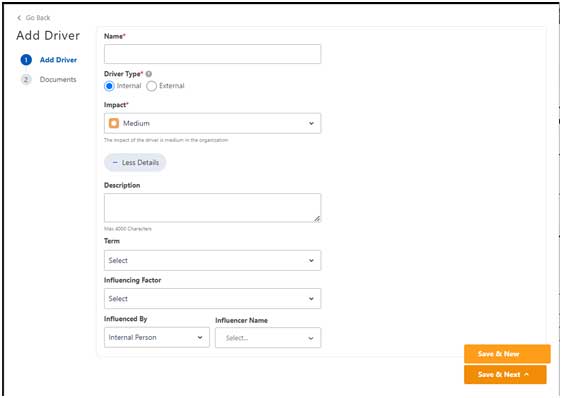 • Driver Type: Driver types can be either Internal/ External influencing factor for the organization.