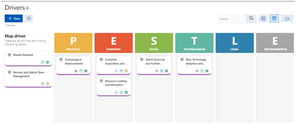 The PESTLE Analysis view provides a clear graphical view of the business environment. The Business Expert can do further grouping of drivers, if they are not properly mapped, as we are also providing Drag/ Drop capability within the screen.