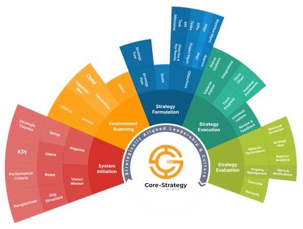 Core-Strategy is an enterprise strategy management tool for modern enterprises. The enterprise strategy management phases as defined within Core-Strategy is described below: