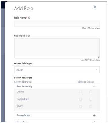 • Users can add a new role by clicking the”” button, entering the role name, description of the role, Selecting the Access Privilege and defining screen based privileges provided to the user.