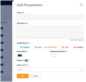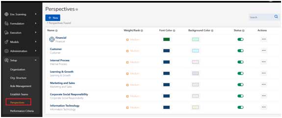 Perspective refers to a category of performance objectives or measures. Most organizations choose the standard four perspectives (financial, customer, internal process, and learning and growth). Organization can add or delete perspectives based on the need of the Organization. The default perspectives that are created when registering an organization are: Financial, Customer, Internal Process, Learning & Growth