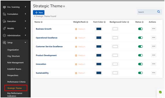 Strategic themes are the primary, high-level business strategies that form the basis for the Organization’s business model. Strategic Themes are also referred as themes as “pillars of excellence”. The default Strategic Themes that are created when registering an organization are:
