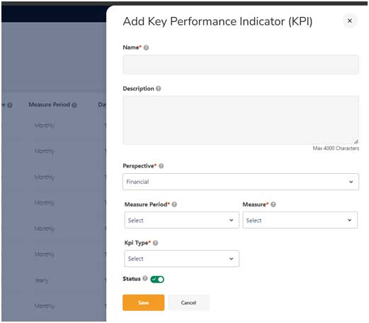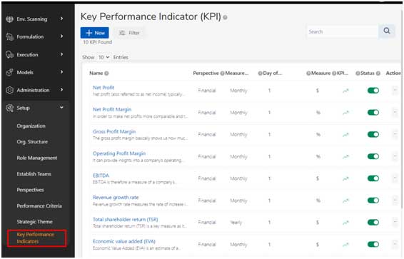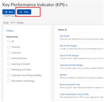 • Perspective: The KPIS show their mapping to the Perspective like Financial, Customer, Internal Process, Marketing & Sales etc.