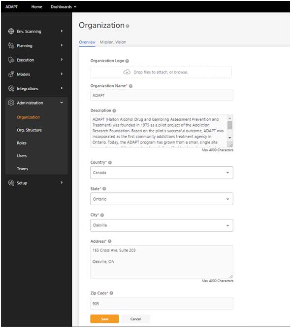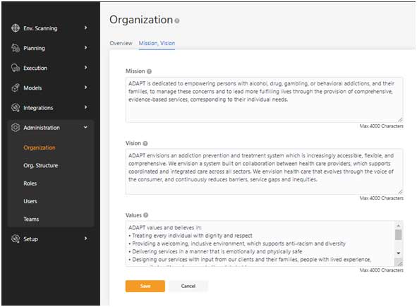 • Mission, Vision, and Values: This section enables the organization to articulate its purpose, aspirations, and core principles that guide its culture and decision-making processes.